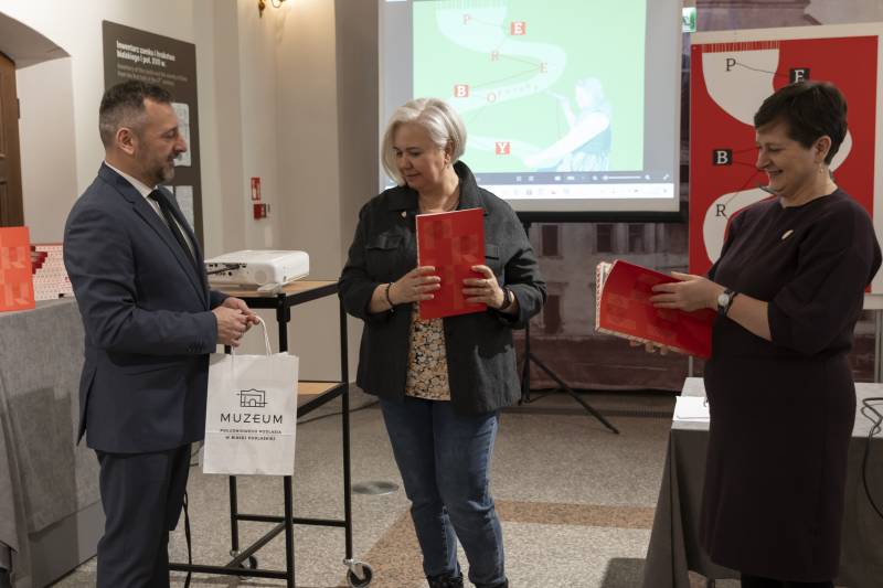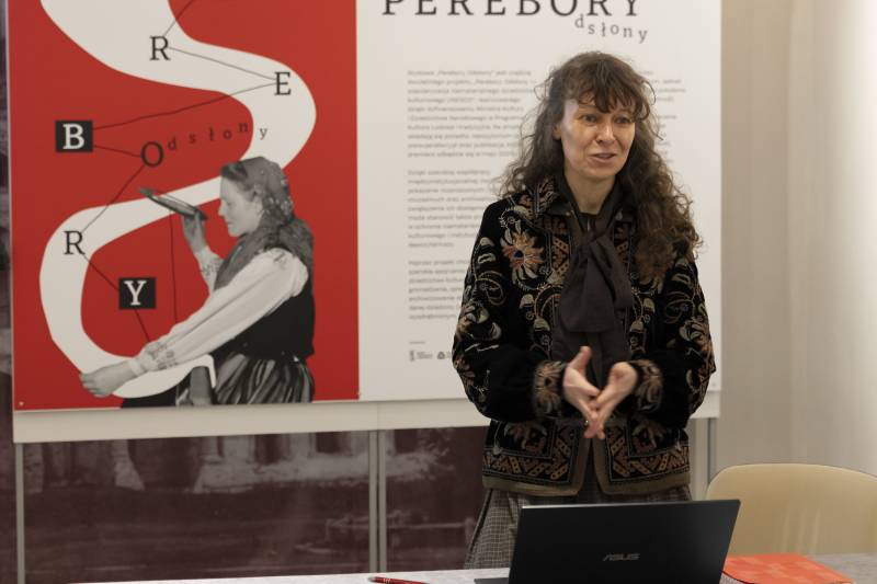"Perebory. Odsłony" to książka „o wzorach tkanych na spódnicach, pasach i ręcznikach z Podlasia, Polesia i Lubelszczyzny – o ornamentach, które porządkowały świat: zaznaczały granice, chroniły i mówiły o przynależności. To wielowarstwowa opowieść, próba uchwycenia, jak ornament może stać się świadectwem”. Po przywitaniu gości przez dyrektora i autorkę książki, uczestnicy wczorajszego spotkania wysłuchali dr hab. Katarzyny Smyk, prof. UMCS, Instytut Nauk o Kulturze UMCS, Katedra Niematerialnego Dziedzictwa Kulturowego, przewodniczącej Rady ds. niematerialnego dziedzictwa kulturowego przy MKiDN podczas prelekcji „Czym jest niematerialne dziedzictwo i jak/dlaczego warto je chronić?” oraz dr Beaty Maksymiuk, Instytutu Nauk o Kulturze UMCS, Katedra Niematerialnego Dziedzictwa Kulturowego podczas prelekcji „Kontekst kulturowy pereborów - zjawiska kulturowe, tradycje i wartości Południowego Podlasia, w aspekcie których należy badać i chronić perebory”.