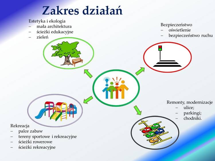 Realizacja budżetu obywatelskiego zależy od pomysłów i potrzeb mieszkańców, ale założono, że główne inwestycje będą dotyczyły spraw estetycznych i ekologii (zieleń, mała architektura, ścieżki edukacyjne), bezpieczeństwa (oświetlenie, bezpieczeństwo ruchu), remontów i modernizacji (ulice, parkingi, chodniki) oraz rekreacji (place zabaw, ścieżki rowerowe, itp.).