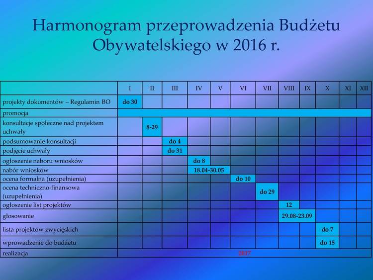 Uchwalenie budżetu poprzedzą konsultacje społeczne. Po przegłosowaniu uchwały przez radnych będzie można rozpocząć nabór wniosków, połączony z ich merytorycznymi konsultacjami aby mieszkańcy otrzymali możliwość fachowej pomocy w przygotowaniu dokumentów.
