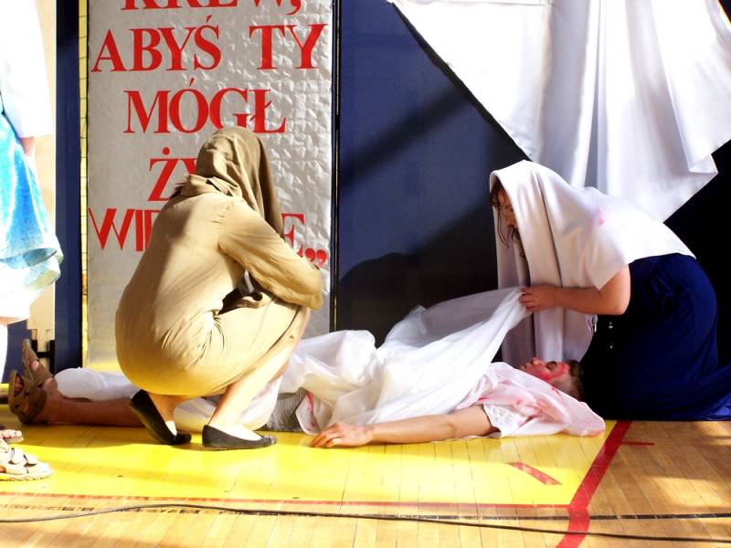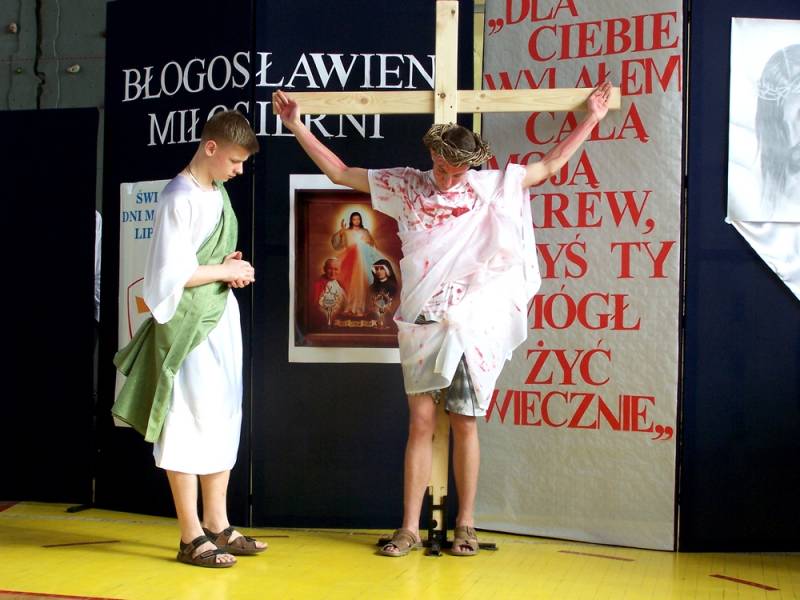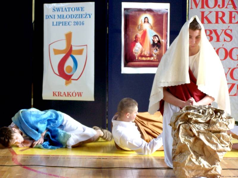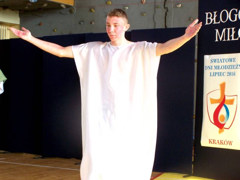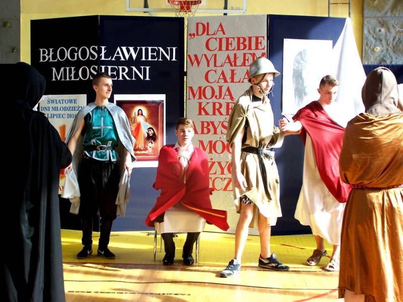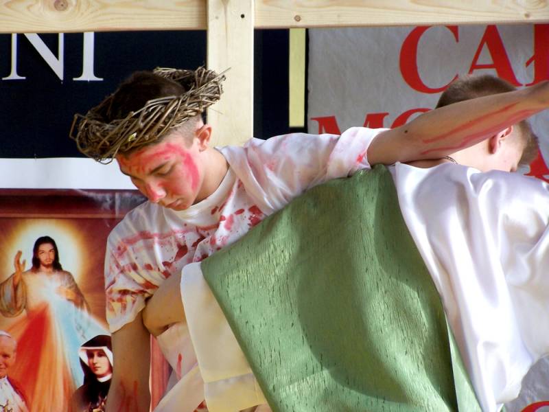 Wszystkich obecnych gorąco witał dyrektor Daniel Sikona. W czasie przedstawienia nie zabrakło śpiewów, w tym znanego wszystkim hymnu Błogosławieni Miłosierni oraz pantomimy, która z pełnym profesjonalizmem przybliżyła wszystkim wizję męki, śmierci i zmartwychwstania Pana Jezusa, z nawiązaniem do zbliżających się świąt Wielkanocnych.