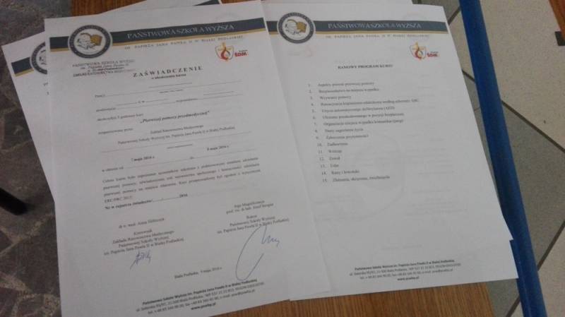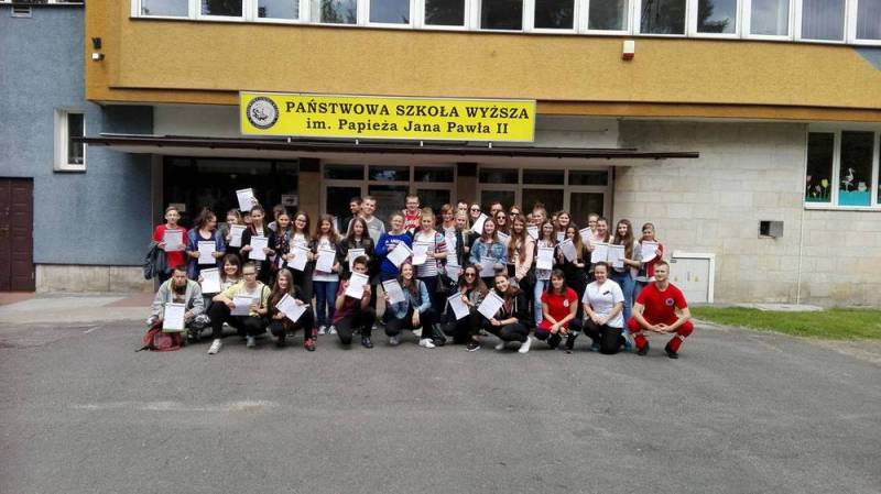 9 maja w Państwowej Szkole Wyższej im. Jana Pawła II wolontariusze Światowych Dni Młodzieży rejonu Biała Podlaska uczestniczyli w szkoleniu z pierwszej pomocy. Zajęcia w grupach poprowadzili nauczyciele akademiccy. Uczestnicy poznali prawne aspekty pierwszej pomocy, a także dowiedzieli się jak zachować bezpieczeństwo na miejscu wypadku i prawidłowo przeprowadzić resuscytację.