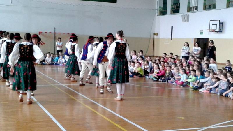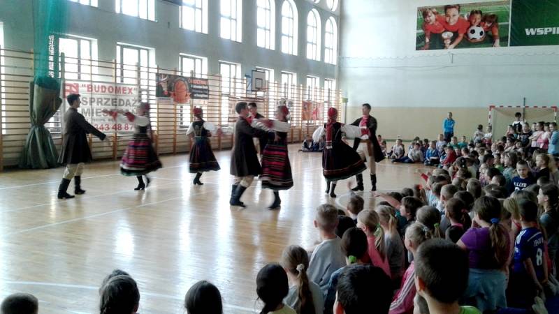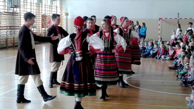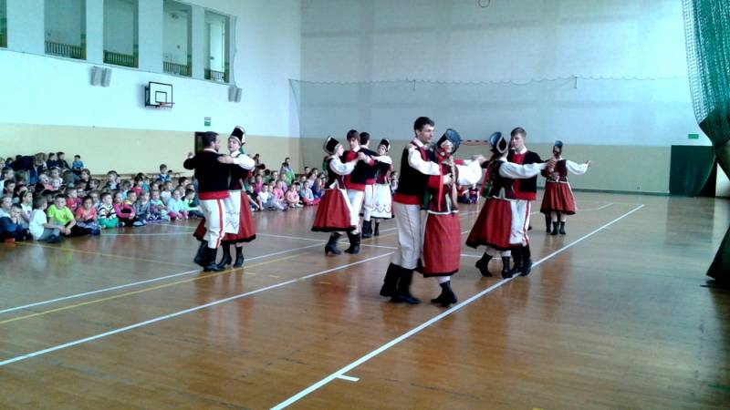 Wesołe przyśpiewki i skoczne tańce bardzo spodobały się uczniom najmłodszych klas. Atrakcją były też regionalne, barwne stroje ludowe, w których występowali tancerze. Oprócz fascynującego występu członkowie zespołu przygotowali także zabawy na ludowa nutę z młodą widownią. Dzieci przyjęły zaproszenie do wspólnej zabawy i radośnie pląsały ze studentami.