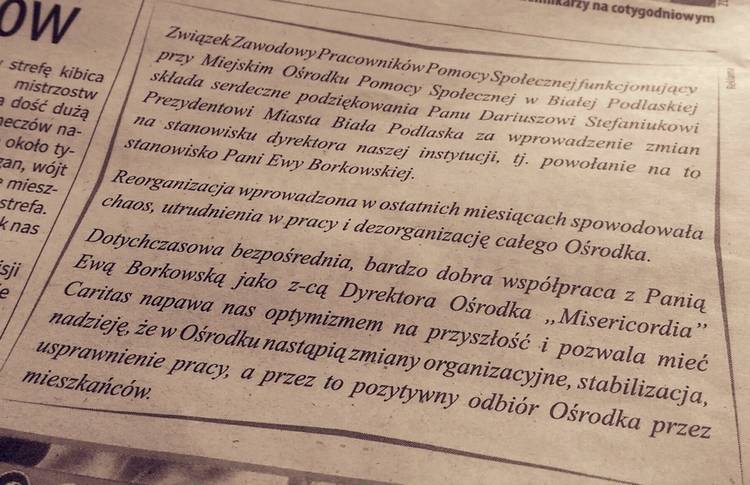 Po kilkunastu latach pracy w bialskim Caritasie Ewa Borkowska pokieruje miejską instytucją społeczną. Zmiana okazała się na tyle ważna i potrzebna, że pracownicy MOPS wyrazili swoją wdzięczność prezydentowi Dariuszowi Stefaniukowi w specjalnym ogłoszeniu, opublikowanym w jednym z bialskich tygodników.