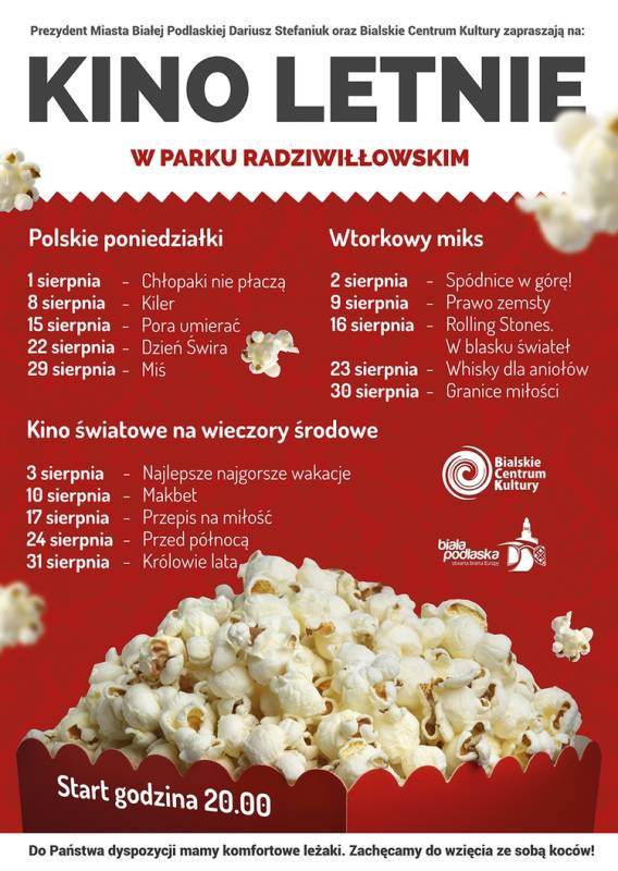 Kino Letnie w Parku Radziwiłłowskim ruszy 1 sierpnia seansem Chłopaki nie płaczą, a zakończy ostatniego dnia miesiąca pokazem amerykańskiej komedii Królowie lata. Początek każdego filmu o godz. 20.00. Wzorem ubiegłego roku nie zabraknie atrakcyjnych gadżetów, przygotowanych dla uczestników każdego seansu, wygodnych leżaków i smacznych, bezalkoholowych drinków.