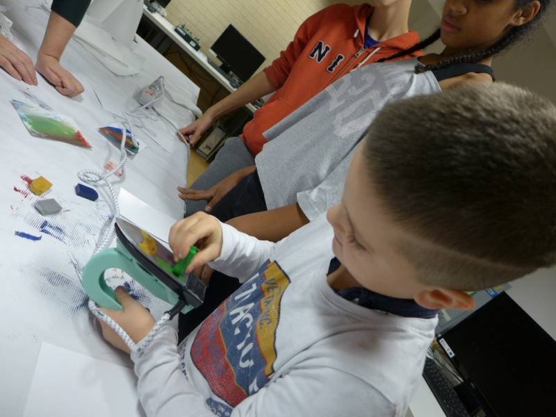 Spotkanie było także świetną okazją do eksperymentów z enkaustyką, czyli techniką malarską polegającą na malowaniu farbami woskowymi i żelazkiem. Dzięki warsztatom powstały przepiękne, kolorowe i radosne obrazy.