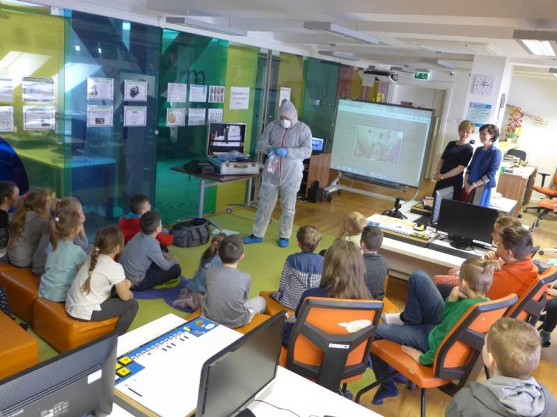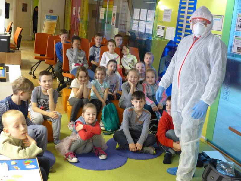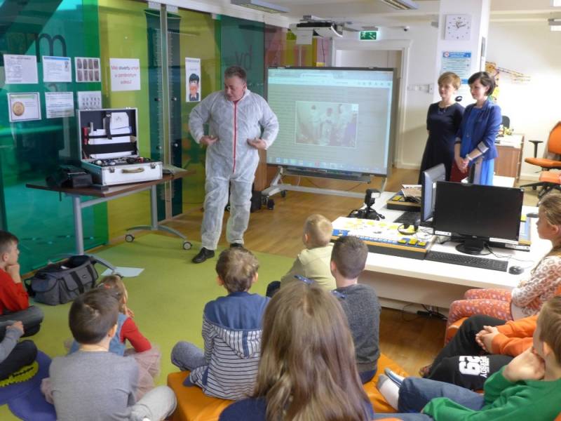 Aspirant w ciekawy sposób zaprezentował uczestnikom zawartość swojej tajemniczej walizki. Zarówno dzieci jak i dorośli dowiedzieli się w jaki sposób profesjonalnie zabezpieczane są ślady na miejscu zdarzenia, jaki specjalny strój nosi technik kryminalistyki oraz jak odpowiedzialną wykonuje pracę.