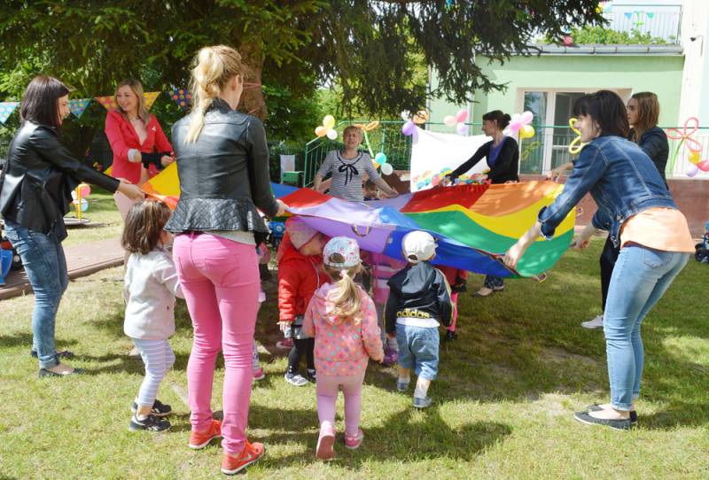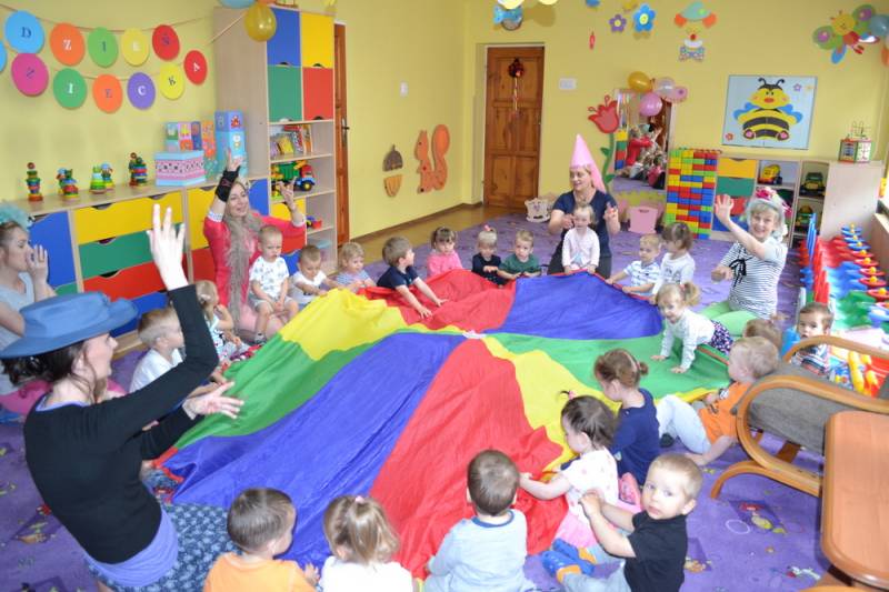 Już po śniadaniu dyrektor Agnieszka Kulicka oraz panie przebrane w barwne stroje z wypożyczalni „Bajka”, przygotowały liczne atrakcje. Było czarowanie słodkości oraz prezentów jak również wspólne zabawy. Zamiast codziennych zajęć maluszkom zaproponowano zabawy na świeżym powietrzu z wesołą muzyką, tańcami, zabawą z chustą animacyjną oraz ogromnymi bańkami mydlanymi.