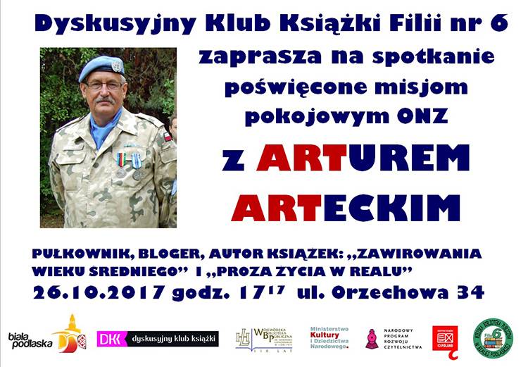 Dyskusyjny Klub Książki działający przy filii nr 6 Miejskiej Biblioteki Publicznej zaprasza nam spotkanie poświęcone misjom pokojowych ONZ. Gościem będzie pułkownik rezerwy Artur Artecki. Odbędzie się ono 26 października o godzinie 17.17 w siedzibie filii przy ulicy Orzechowej 34.