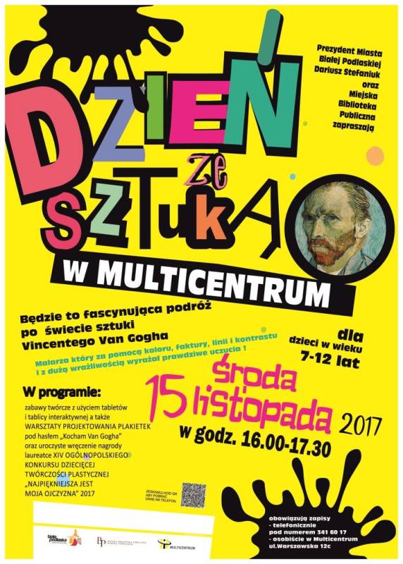 Multicentrum zaprasza dzieci w wieku 8-12 lat na „Dzień ze sztuką. Wydarzenie odbędzie się 15 listopada o godzinie 16.00. Spotkanie ma na celu uzmysłowić uczestnikom, jak ważne jest obcowanie ze sztuką. Przedstawiona zostanie postać niezwykłego malarza Vincenta Van Gogha. Uczestnicy rozmawiać będą na temat jego twórczości i wrażliwości na kolor.