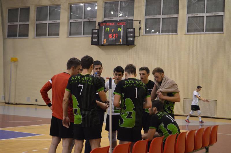 W miniony weekend zagrali również siatkarze AZS AWF. W meczu, który śmiało można określić hitem kolejki, po pięciosetowej walce górą byli zawodnicy z bialskiej Akademii Wychowania Fizycznego. Mecz rozpoczął się niekorzystnie dla gospodarzy. Na początku pierwszego seta, goście bardzo szybko zdołali odskoczyć na 8 punkową przewagę (12:4). Powodem takiej sytuacji była bardzo dobra zagrywka zawodników przyjezdnych, którzy odrzucili bialczan od siatki, a to przełożyło się na problemy z wyprowadzeniem skutecznego ataku. Akademicy z Białej Podlaskiej obudzili się w drugiej części seta i od tego momentu dotrzymywali kroku bardziej doświadczonym zawodnikom z Wojsławic, którzy jednak nie zaprzepaścili wypracowanej przewagi i wygrali pierwszą partię 25:19. Podrażniona młodzież z Białej wyszła mocno zmotywowana w drugiej partii. Od początku to oni zdominowali grę na siatce i w polu zagrywki, co dało im wysoką wygraną 25:17.