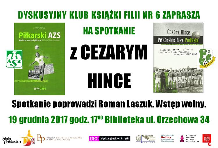 Dyskusyjny Klub Książki Filii nr 6 zaprasza wszystkich mieszkańców miasta, w szczególności fanów piłki nożnej, na spotkanie z Cezarym Hince. Spotkanie, które odbędzie się 19 grudnia 2017 roku (wtorek) o godz.1700 w bibliotece przy ul. Orzechowej 34 poprowadzi Roman Laszuk.
