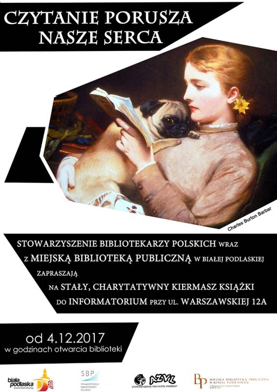 6 grudnia zapraszamy na inaugurację nowej formy Charytatywnego Kiermaszu Książek, który na stałe zagości w murach biblioteki w parku Radziwiłłowskim (I piętro - Informatorium). Pieniądze pochodzące ze sprzedaży książek przekażemy na rzecz bialskiego schroniska „AZYL”.