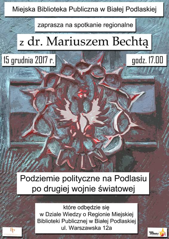 Miejska Biblioteka Publiczna w Białej Podlaskiej zaprasza wszystkich miłośników regionu na spotkanie z historykiem i publicystą dr. Mariuszem Bechtą, które odbędzie się 15 grudnia o godzinie 17.00 w Dziale Wiedzy o Regionie. Uczestnicy spotkania będą mieli okazję wysłuchać wykładu „Podziemie polityczne na Podlasiu po drugiej wojnie światowej”.