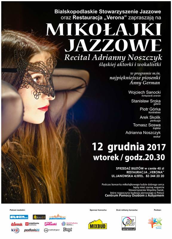 Bialskopodlaskie Stowarzyszenie Jazzowe oraz restauracja Verona zapraszają na Bialskie Mikołajki Jazzowe. Wystąpi śląska aktorka i wokalistka Adrianna Noszczyk z towarzyszeniem znakomitych muzyków jazzowych i klasycznych.