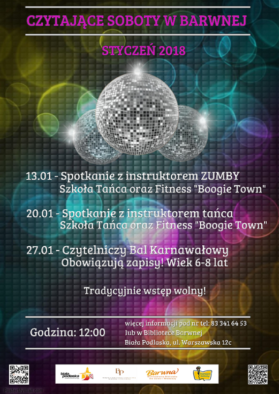W styczniu Miejska Biblioteka Publiczna zaprasza wszystkich mieszkańców miasta na karnawałowe „Czytające Soboty”. Spotkania odbywać się będą w każdą sobotę o godzinie 12.00 w Bibliotece Barwnej przy ulicy Warszawskiej 12c. Wstęp wolny. Wszelkie informacje pod numerem telefonu 83 341 64 53.