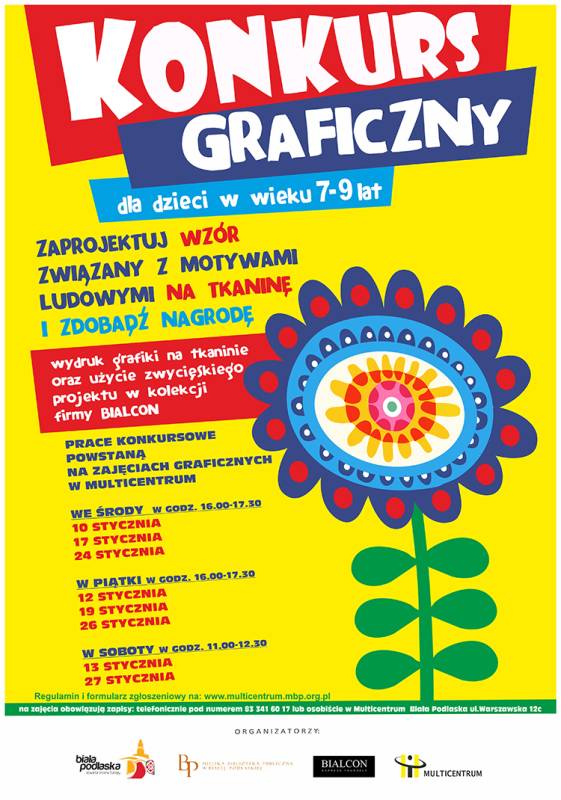 Prace konkursowe powstaną na zajęciach graficznych w Multicentrum. Na zajęcia obowiązują zapisy telefonicznie pod numerem 83 341 60 17 lub osobiście w Multicentrum w Białej Podlaskiej przy ul. Warszawskiej 12c. Szczegółowe informacje znajdują się na plakacie oraz w Regulaminie Konkursu, z którym zapoznać można się na stronie internetowej: www.multicentrum.mbp.org.pl