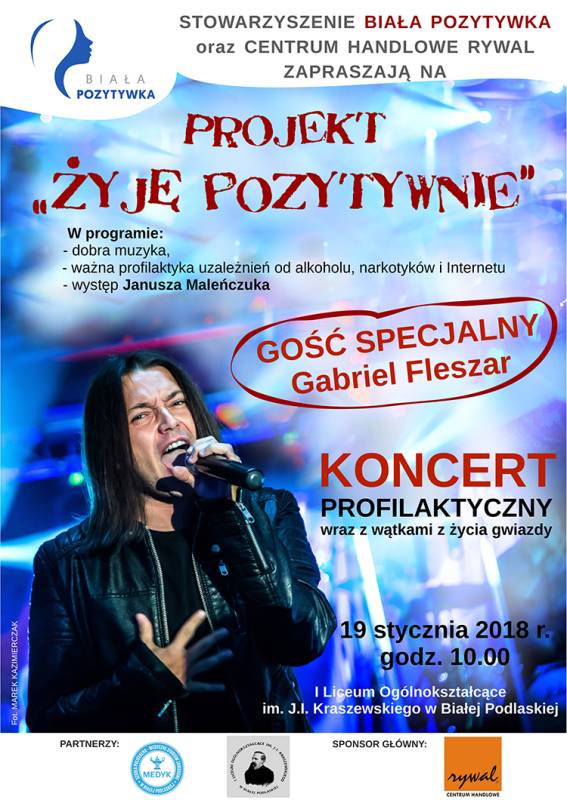 „Żyję pozytywnie" to kolejny projekt Stowarzyszenia Biała Pozytywka. Spotkanie organizowane jest przy współpracy Centrum Handlowego RYWAL w Białej Podlaskiej. Tym razem Pozytywki skupiły się na profilaktyce uzależnień od alkoholu, narkotyków, papierosów i internetu, skierowanej do bialskiej młodzieży.