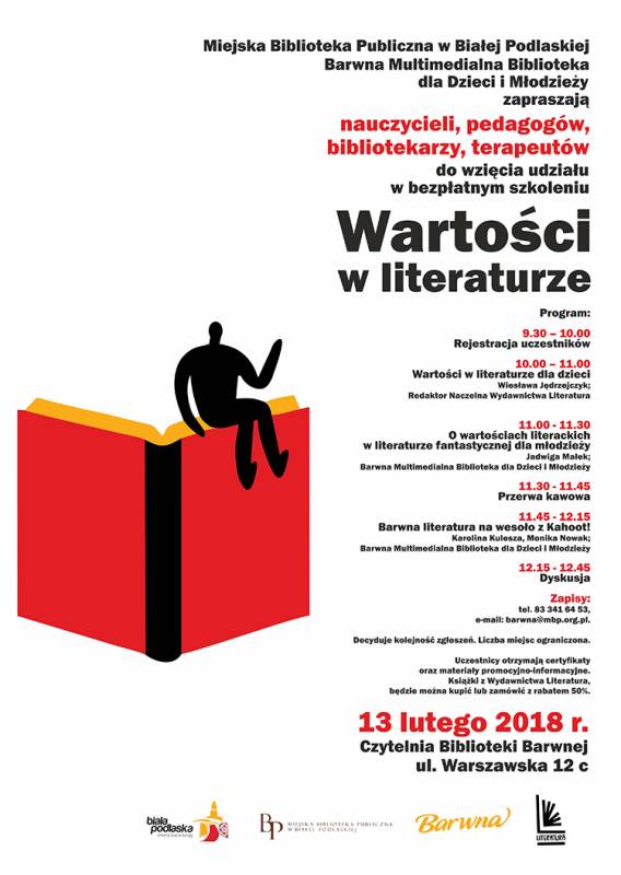 Zapraszamy nauczycieli, pedagogów, bibliotekarzy, terapeutów na bezpłatne szkolenie do Barwnej Multimedialnej Biblioteki dla Dzieci i Młodzieży. Tematem spotkania będą „ Wartości w literaturze”. Głównym prelegentem będzie Pani Wiesława Jędrzejczyk - redaktor naczelna i założycielka Wydawnictwa Literatura.