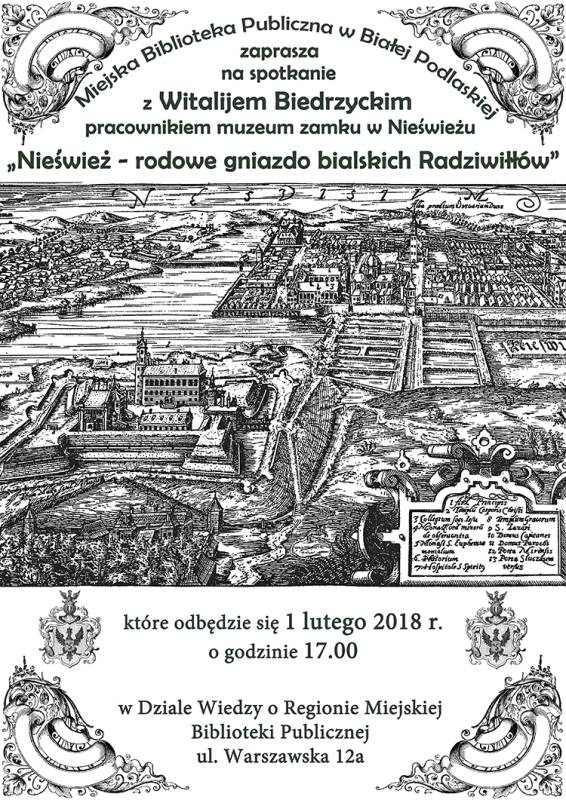 Miejska Biblioteka Publiczna w Białej Podlaskiej zaprasza wszystkich miłośników regionu na spotkanie z Witalijem Biedrzyckim – pracownikiem muzeum zamku w Nieświeżu na Białorusi. Uczestnicy będą mieli okazję wysłuchać wykładu „Nieśwież rodowe gniazdo bialskich Radziwiłłów”.