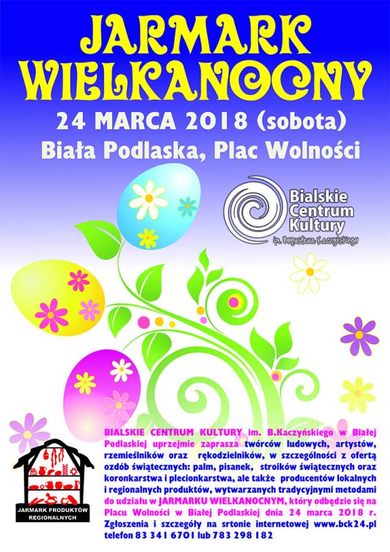 Bialskie Centrum Kultury zaprasza do prezentacji i sprzedaży własnej oferty w ramach stoiska podczas Jarmarku Wielkanocnego, który odbędzie się24 marca. Organizatorzy oczekują na zgłoszenia zarówno: twórców ludowych, artystów, rzemieślników, rękodzielników, ale także wytwórców lokalnych i regionalnych produktów na stół świąteczny, wytwarzanych tradycyjnymi metodami.