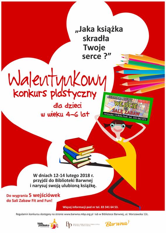 Od 12 do 14 lutego Biblioteka Barwna zaprasza dzieci w wieku 4-6 lat do udziału w walentynkowym konkursie plastycznym. Do wygrania wejściówki do Sali Zabaw Fit and Fun.