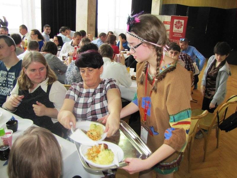 Na sali pojawili się wolontariusze z bialskiego Centrum Wolontariatu prowadzonego przez Caritas diecezjalną. Towarzyszyli niepełnosprawnym w zabawach tanecznych i pomagali roznosić obiad przygotowany przez bialskie Centrum Integracji Społecznej.