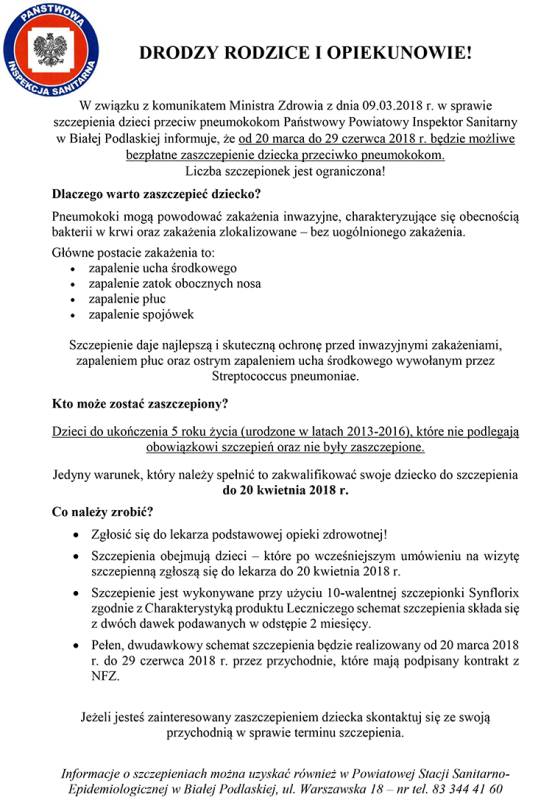 W związku z komunikatem ministra zdrowia w sprawie szczepienia dzieci przeciw pneumokokom, Państwowy Powiatowy Inspektor Sanitarny w Białej Podlaskiej informuje, że od 20 marca do 29 czerwca będzie możliwe bezpłatne zaszczepienie dziecka przeciwko pneumokokom.