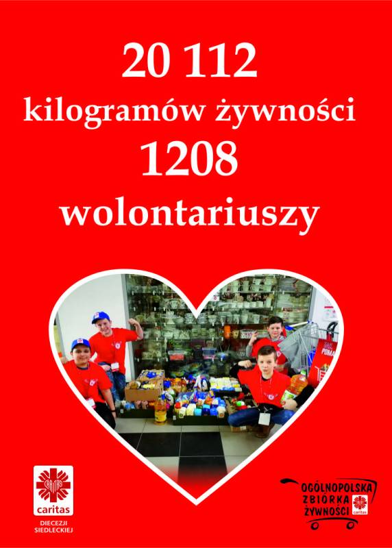 – Bardzo dziękujemy wszystkim ludziom, którzy nie przeszli obojętnie obok koszyków zbiórkowych i wolontariuszy - podkreśliła Monika Rybaczewska, koordynator zbiórki żywności. I dodaje: – Mieszkańcy tych miejscowości, poza przekazywaniem żywności, wspierali naszych wolontariuszy także dobrym słowem. Z zebranych produktów będziemy robić paczki przedświąteczne oraz doposażymy jadłodajnie w Siedlcach i w Białej Podlaskiej. Pragniemy także gorąco podziękować kierownikom sklepów, w których była przeprowadzona akcja, oraz właścicielom małych sklepików za życzliwość i udostępnienie przestrzeni do realizacji tego przedsięwzięcia.
