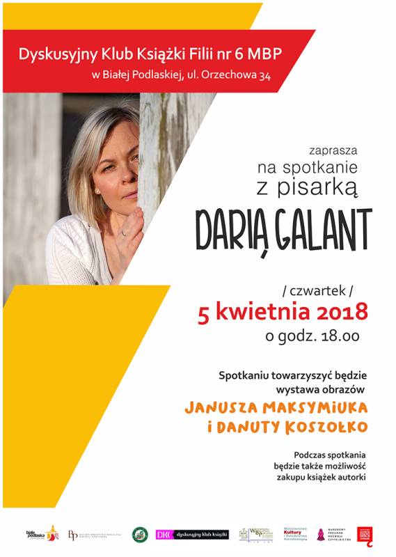 Dyskusyjny Klub Książki filii nr 6 zaprasza na spotkanie z Darią Galant, powieściopisarką, poetką, dramatopisarką, reżyserem. Spotkanie odbędzie się 5 kwietnia o godzinie 18.00 w bibliotece przy ul. Orzechowej 34.