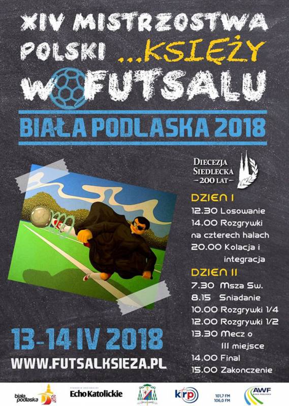 Z okazji 200-lecia działalności Diecezji Siedleckiej w Białej Podlaskiej rozegrane zostaną 14. mistrzostwa Polski księży w futsalu. Zmagania duchownych odbywać się będą w czterech bialskich halach. Uroczyste otwarcie mistrzostw nastąpi w piątek 13 kwietnia o godz. 12.00 w auli AWF przy ul. Akademickiej 2.