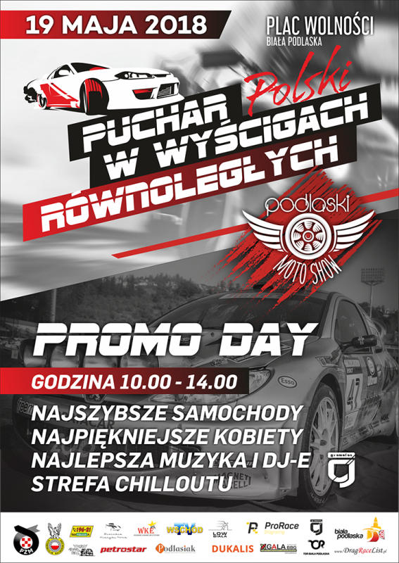 Tydzień przed imprezą, w sobotę 19 maja na placu Wolności odbędzie się PROMO DAY Podlaskiego Moto Show. W godzinach 10.00-14.00 będzie można zobaczyć najszybsze auta, zrobić sobie zdjęcie i spędzić czas z fanami motoryzacji w naszej strefie chilloutu, którą współtworzymy wraz z bialskim klubem Gramofon, w którym 25 maja odbędzie się afterparty dla widzów i zawodników.