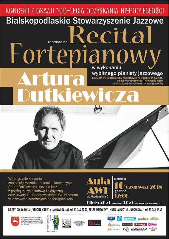 Zbliża się koncert znakomitego pianisty jazzowego - Artura Dutkiewicza. Widowisko organizowane jest z okazji 100. rocznicy odzyskania przez Polskę niepodległości. Koncert odbędzie się 10 czerwca o godz.17 w auli AWF przy ul. Akademickiej 2. Organizatorem koncertu jest Bialskopodlaskie Stowarzyszenie Jazzowe.