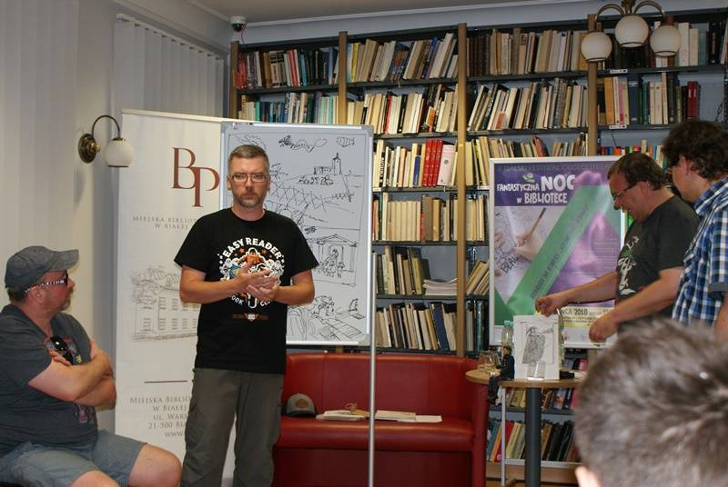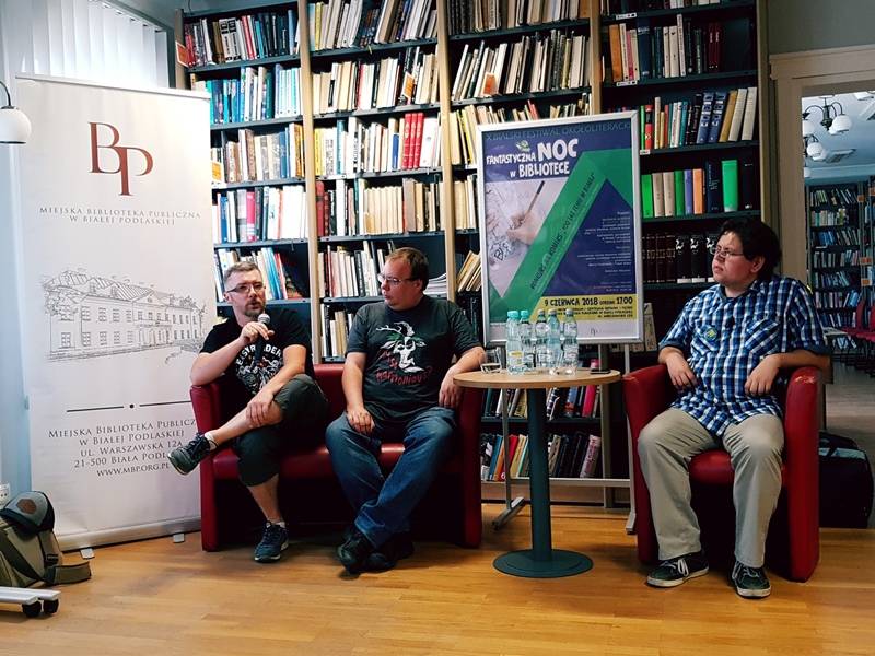Paweł Majka – czołowy pisarz polskiej literatury science-fiction oraz Marcin Kułakowski, pochodzący z Białej Podlaskiej rysownik komiksów i ilustrator opowiadań m.in. w Nowej Fantastyce odpowiadali na pytania Grzegorza Czapskiego – moderatora wieczoru.