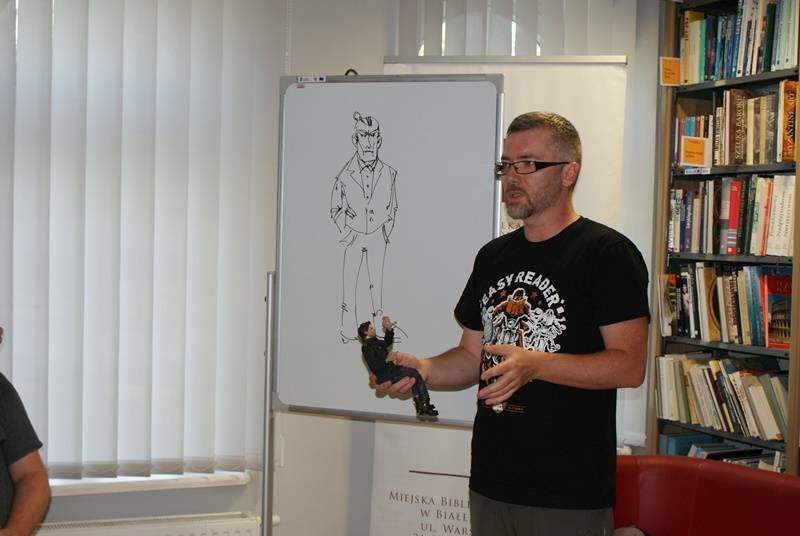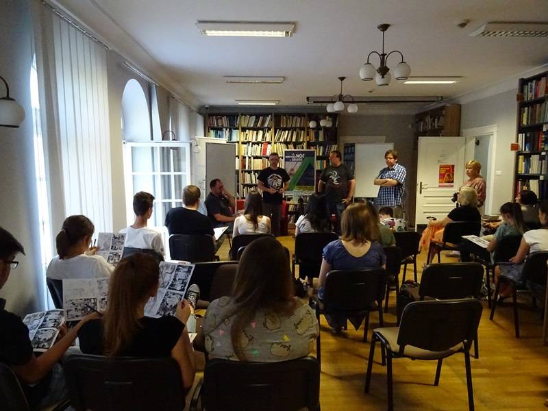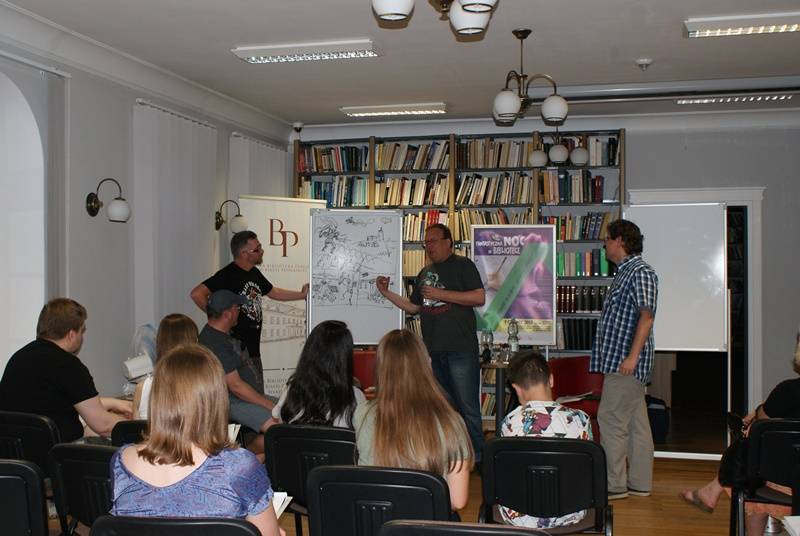 Trwające niespełna trzy godziny warsztaty były pełne celnych wskazówek: jak dobrze opowiedzieć historię, co jest najważniejsze w treści, jakie znaczenie ma puenta opowieści, czy należy wiernie trzymać się raz nakreślonej postaci, czy też w trakcie opowieści bohater może ewaluować? Na te i inne pytania, inspirując słuchaczy, chętnie i wyczerpująco odpowiadali prelegenci. Przyszli twórcy komiksów aktywnie uczestniczyli w warsztatach, które przygotowywały do udziału w ogłoszonym przez Miejską Bibliotekę Publiczną konkursie na komiks „100 lat temu w Białej ”. Usłyszeliśmy i zobaczyliśmy kilka fantastycznych wersji związanych z odzyskaniem przez Polskę niepodległości. Na naszych oczach powstał przykładowy panel komiksowy, opowiadający historię cyborga, który ratuje zamkową wieżę przed zburzeniem i zaborcami. A może bohaterem komiksowym uczynić femme fatale, która używa niecnych środków w dobrych celach i tym sposobem rozprawia się z zaborcą? Nieszablonowe pomysły, które pod wpływem chwili i warsztatów rodziły się w głowach uczestników Fantastycznej Nocy w Bibliotece rozbudziły nasza ciekawość.