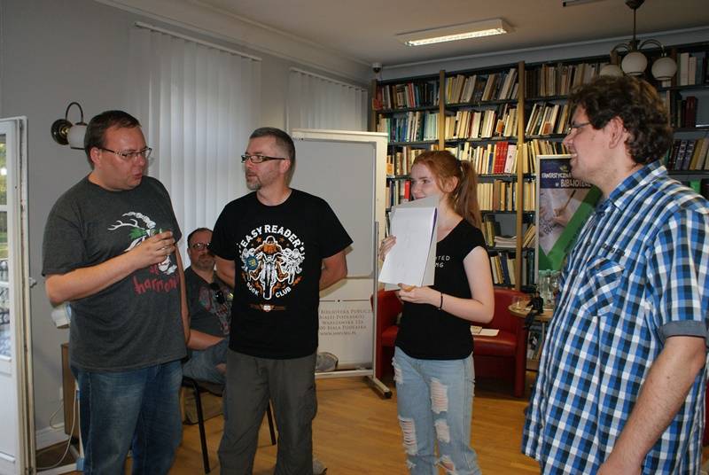 Przerwa przed warsztatami była okazją do zdobycia autografu na specjalnie na tę okoliczność przygotowanym przez Marcina Kułakowskiego dyplomie, przedstawiającym swobodną interpretację herbu naszego miasta. Możliwość zakupu książki i zdobycia autografu autora zawsze cieszy się dużym zainteresowaniem wśród uczestników, tak też było w czasie Fantastycznej Nocy w Bibliotece. Przerwa umożliwiła rozmowę mniej oficjalną z zaproszonymi gośćmi, dała też szansę podzielenia się swoimi przemyśleniami i pomysłami.