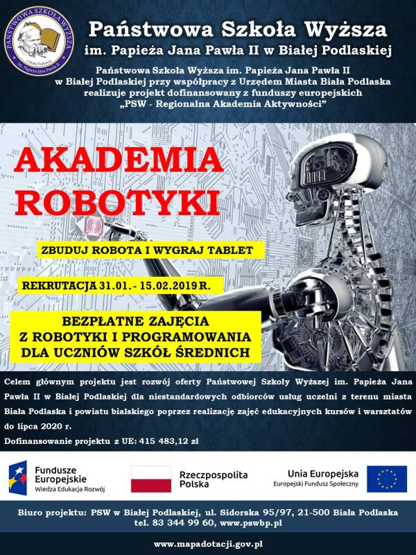 W dniach 31.01 - 15.02.2019 r. przyjmujemy zgłoszenia do Akademii Robotyki - 60 godzin zajęć z zakresu robotyki i programowania dla uczniów szkół średnich. W ramach zajęć uczniowie w dwuosobowych zespołach zbudują własny model robota. Najlepsze zostaną nagrodzone tabletami. Zajęcia będą realizowane w okresie luty - czerwiec 2019 r.