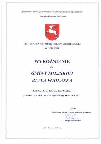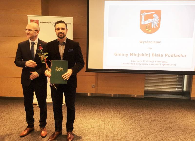 Gmina Miejska Biała Podlaska została wyróżniona w konkursie „Samorząd Przyjazny Ekonomii Społecznej” organizowanym przez Regionalny Ośrodek Polityki Społecznej. Została nominowana przez Caritas Diecezji Siedleckiej. Doceniono aktywne wspieranie działalności Centrum Integracji Społecznej w Białej Podlaskiej. Wyróżnienie prezydent Michał Litwiniuk odebrał 18 marca.