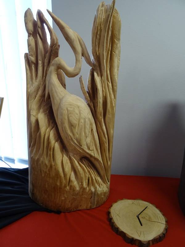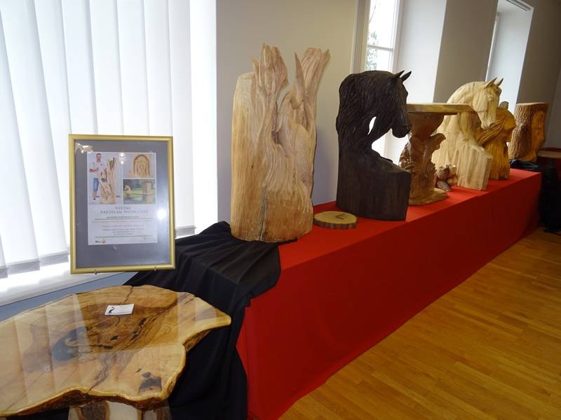 Podczas wernisażu w bibliotece pan Radek zdradził, że głównym narzędziem jego pracy jest pilarka spalinowa, do której dokupuje specjalne końcówki do rzeźbienia. Do wykończenia bardziej precyzyjnych szczegółów używa też dłuta i szlifierki. Przy tworzeniu najważniejsza jest jednak wyobraźnia. Nie zawsze wie, co powstanie z kolejnego kloca drewna. Ale często już po pierwszych cięciach wyobraźnia zaczyna pracować i powstają dzieła doceniane w całej Polsce, jak czaple w szuwarach, głowy koni, czy imponujących rozmiarów ławka z głową konia po jednej i z wieżą zegarową po drugiej stronie. Ulubionym tematem są właśnie konie, być może dlatego, że pan Radek pracuje z tymi zwierzętami na co dzień. Kiedyś pracował jako masztalerz w stadninie w Janowie Podlaskim, obecnie w stajniach Dworu Droblin.