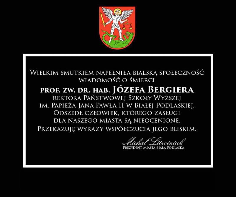 21 marca odszedł prof. zw. dr hab. Józef Bergier - rektor Państwowej Szkoły Wyższej im. Papieża Jana Pawła II w Białej Podlaskiej.