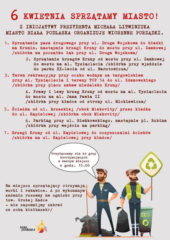 Celem akcji „Sprzątanie miasta 6 kwietnia” zainicjowanej przez prezydenta Michała Litwiniuka jest nie tylko porządkowanie przestrzeni wokół nas, ale też wspólne działanie – integracja różnych środowisk. Chęć przyłączenia się do akcji zgłosiły bialskie stowarzyszenia, koła hobbystyczne, kluby. Dołączyć do dowolnej grupie na wybranej trasie może każdy – wystarczy po prostu przyjść do wybranego miejsca zbiórki. Wytyczono siedem tras, których przebieg opisano na plakacie.