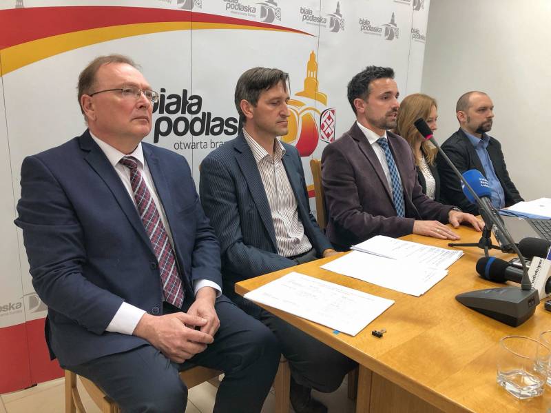 Prezydent Michał Litwiniuk, dr Stanisław Romanowski - naczelnik Wydziału Edukacji, Kultury i Sportu, dr Paweł Borek - dyrektor Miejskiej Biblioteki Publicznej, Violetta Jarząbkowska - dyrektor Muzeum Południowego Podlasia i Zbigniew Kapela - dyrektor Bialskiego Centrum Kultury zaprezentowali podczas konferencji prasowej kalendarz najważniejszych wydarzeń kulturalnych na maj i czerwiec.