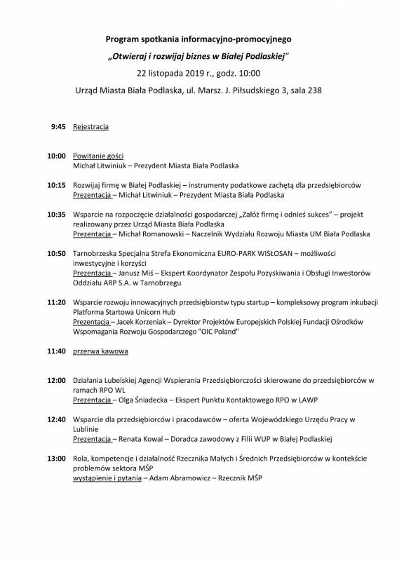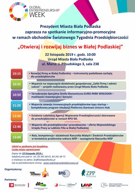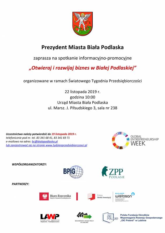 22 listopada 2019 r. odbędzie się w Urzędzie Miasta Biała Podlaska spotkanie "Otwieraj i rozwijaj biznes w Białej Podlaskiej", na które zaprasza prezydent Michał Litwiniuk.To wydarzenie w ramach Światowego Tygodnia Przedsiębiorczości, który przypada w dniach 18.11.2019 r.– 24.11.2019 r.
