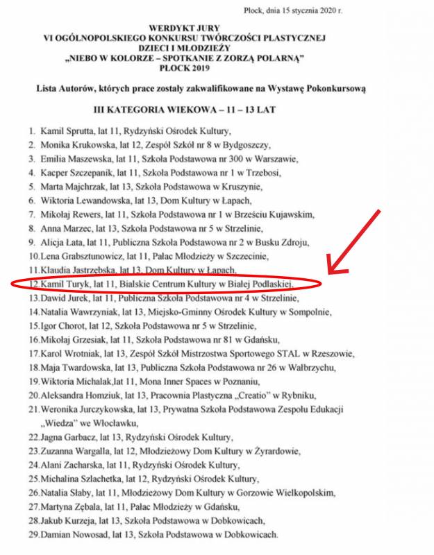 Mamy kolejny wspaniały artystyczny sukces na koncie uczestników zajęć w Pracowni Grafiki Komputerowej „PIKSEL” w Bialskim Centrum Kultury. 11-letni Kamil Turyk, podopieczny pani Lilli Wielgan-Michaluk, został wyróżniony udziałem w wystawie pokonkursowej w VII OGÓLNOPOLSKIM KONKURSIE TWÓRCZOŚCI PLASTYCZNEJ DZIECI I MŁODZIEŻY „NIEBO W KOLORZE – SPOTKANIE Z ZORZĄ POLARNĄ”.