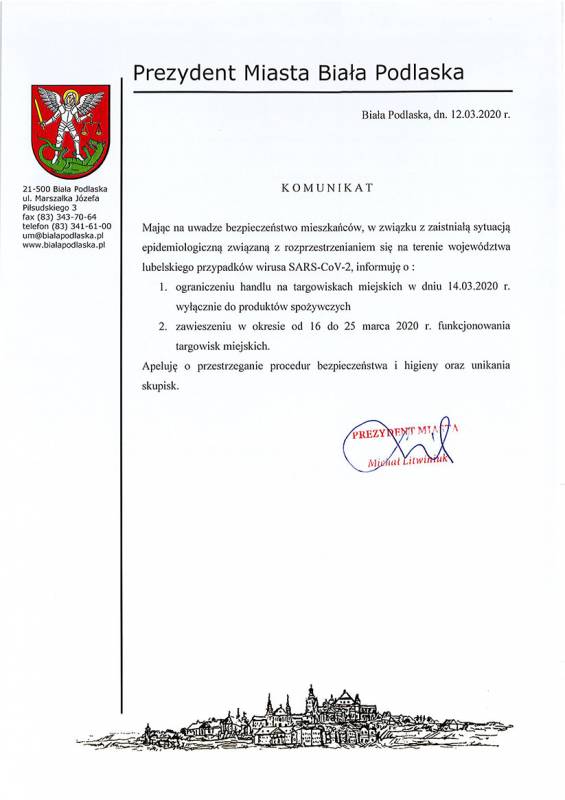 Prezydent Miasta Biała Podlaska zawiesza funkcjonowanie targowisk miejskich od 16 marca br. do 25 marca br.