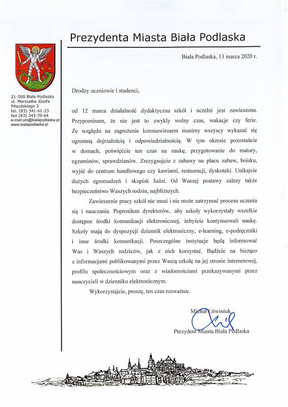 Prezydent Michał Litwiniuk prosi uczniów i studentów o unikanie skupisk i kontynuowanie nauki w dniach zawieszenia zajęć dydaktycznych.