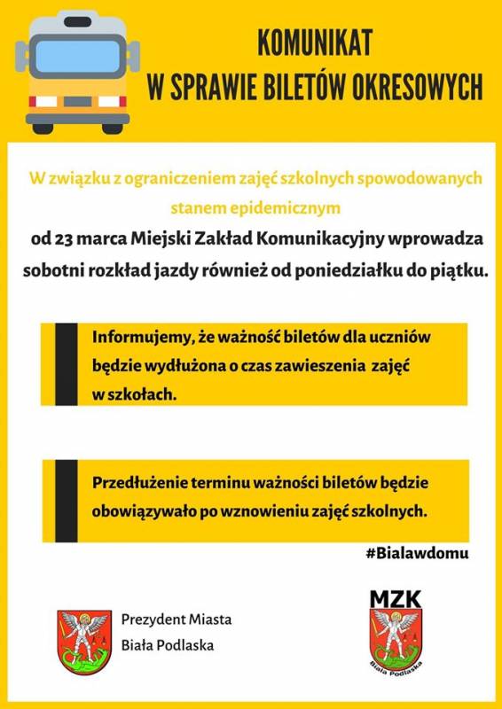 Od 23 marca w ciągu tygodnia autobusy MZK kursują według sobotniego rozkładu jazdy. W związku z zawieszeniem zajęć szkolnych ważność uczniowskich biletów okresowych będzie wydłużona o ten okres.