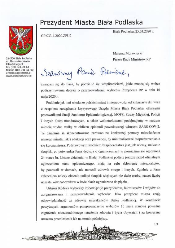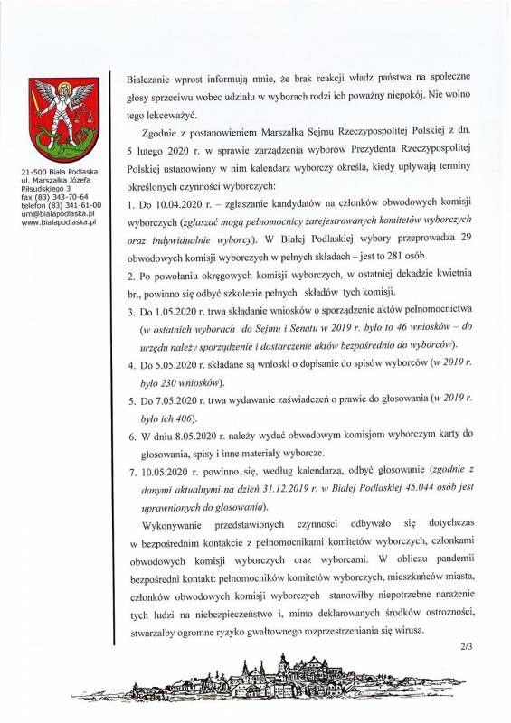 Ustawa Kodeks wyborczy zobowiązuje prezydentów, burmistrzów i wójtów do zorganizowania i przeprowadzenia wyborów. Jako prezydent miasta czuję odpowiedzialność za zdrowie mieszkańców Białej Podlaskiej. W kontekście powyższych argumentów przeprowadzenie wyborów 10 maja stanowi poważne zagrożenie nieuzasadnionego narażenia zdrowia i życia obywateli i za konieczne uważam przeniesienie ich na termin późniejszy. Bialczanie wprost informują mnie, że brak reakcji władz państwa na społeczne głosy sprzeciwu wobec udziału w wyborach rodzi ich poważny niepokój. Nie wolno tego lekceważyć.