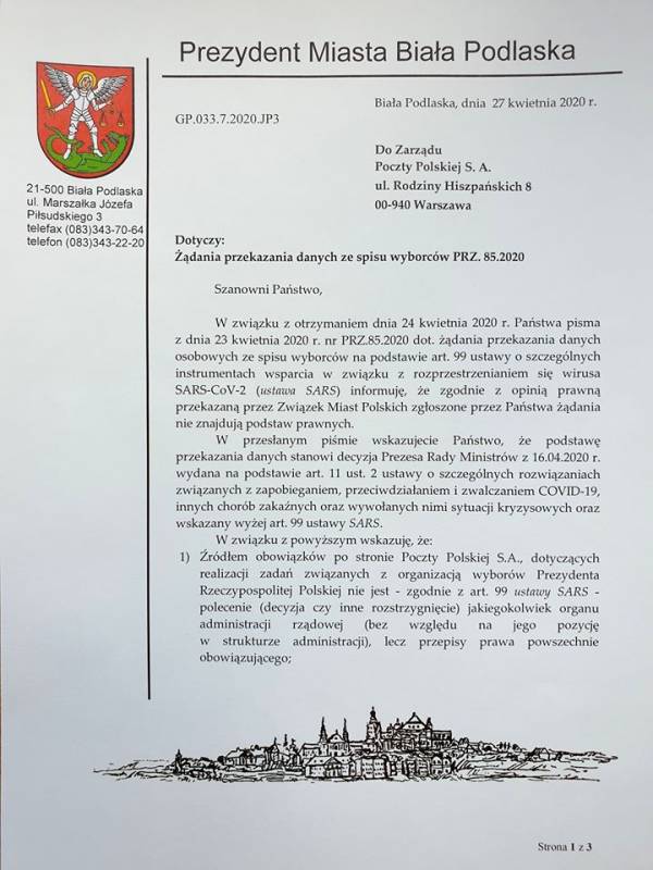 z „organizacją wyborów Prezydenta Rzeczypospolitej Polskiej”. Decyzja ta nie nakłada na Pocztę Polską S.A. „innych obowiązków”, niż organizowanie tych wyborów, w związku z czym przepis art. 99 ustawy z dnia 16 kwietnia 2020 r. nie daje Poczcie Polskiej S.A. uprawnienia do otrzymania danych ze spisu wyborców w celu wykonania obowiązków wynikających z tej decyzji. Zatem decyzja Prezesa Rady Ministrów z dnia 16 kwietnia 2020 r. (BPRM.4820.2.3.2020), ze względu na jej przedmiot, nie może stanowić podstawy do wystąpienia z wnioskiem w trybie art. 99 ustawy z dnia 16 kwietnia 2020 r. Aby Poczta Polska mogła w trybie art. 99 wystąpić o dane „potrzebne do realizacji zadań związanych z organizacją wyborów prezydenta RP”, musi mieć takie zadania nałożone w drodze ustawy. W stanie prawnym z 23 kwietnia br. (data pisma Poczty Polskiej SA do gmin) Poczta Polska nie ma żadnych ustawowo określonych zadań w wyborach prezydenta RP. Poczta uzyska uprawnienie, na które się powołuje, po ewentualnym wejściu w życie odpowiednich przepisów ustawowych. Organ będący adresatem wniosku zobowiązany jest ustalić, czy wnioskowane dane są potrzebne do realizacji zadań związanych z organizacją wyborów Prezydenta Rzeczypospolitej Polskiej ,bądź w celu wykonania innych obowiązków nałożonych przez organy administracji rządowej. W opinii Prezydenta Miasta Biała Podlaska nie wykazaliście Państwo, by dane takie były do tego celu potrzebne; - W dniu 18 kwietnia 2020 roku, tj. po wydaniu Decyzji, wszedł w życie 102 ustawy SARS. Zgodnie z tym przepisem, w okresie obowiązywania stanu zagrożenia epidemicznego albo stanu epidemii przy przeprowadzaniu wyborów powszechnych na Prezydenta Rzeczypospolitej Polskiej zarządzonych w 2020 r. nie stosuje się przepisów ustawy z dnia 5 stycznia 2011 r. - Kodeks wyborczy w zakresie m.in. głosowania korespondencyjnego, o którym mowa w art. 53a k. w. Mając powyższe na uwadze należy przyjąć, iż od dnia 18 kwietnia 2020 roku decyzja nie jest skuteczna i nie może być wykonana, bowiem przepisy dotyczące głosowania w trybie korespondencyjnym zostały zawieszone - nie mogą być stosowane do czasu zakończenia stanu epidemii. Jej dalsze wykonywanie będzie możliwe do zniesieniu stanu epidemii, o ile nastąpi to przed wyborami Prezydenta RP zarządzonymi w 2020 roku;