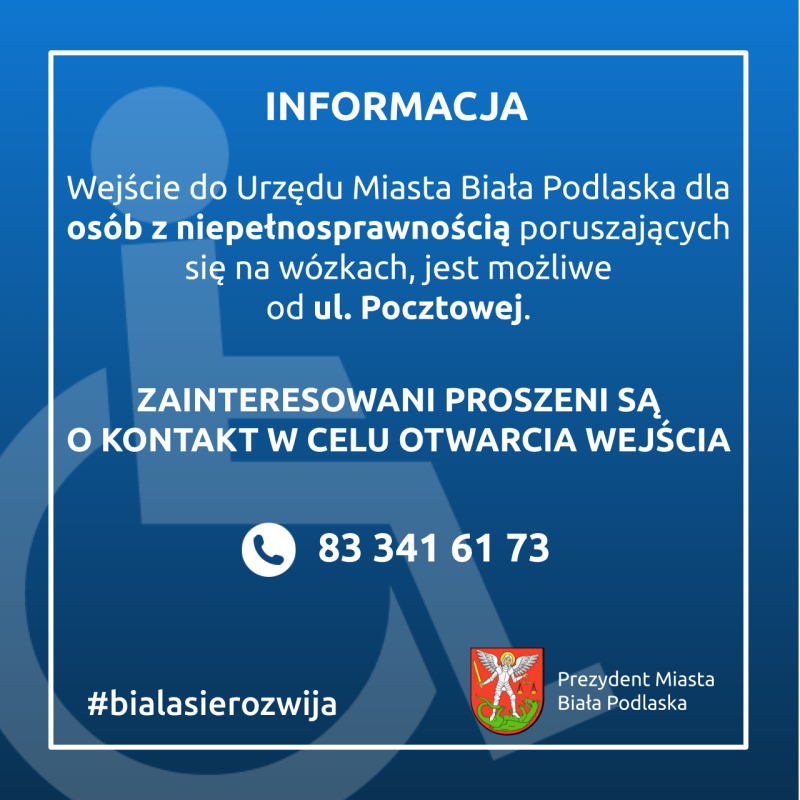 Prosimy o zapoznanie się z informacjami o dostępności Urzędu Miasta dla osób z niepełnosprawnościami w czasie epidemii oraz przypominamy o możliwości kontaktu z Przedstawicielem Prezydenta ds. Osób z Niepełnosprawnościami.