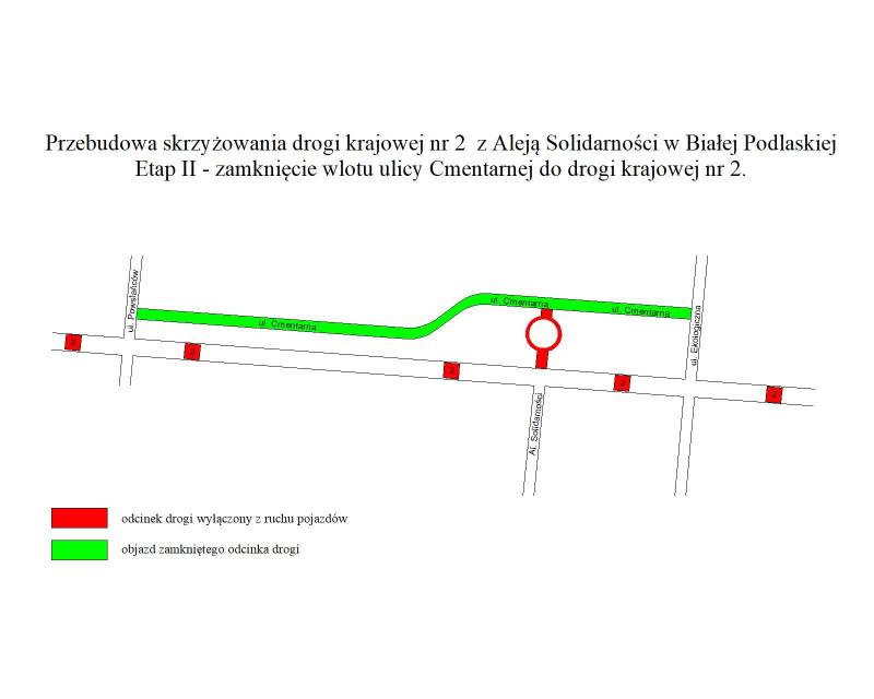 Od 22.06.2020 r. w związku z przebudową skrzyżowań na drodze krajowej nr 2 z ul. Terebelską i Al. Solidarności w ramach realizacji zadania pn. „Poprawa dostępności transportowej w Brześciu i Białej Podlaskiej” – Przebudowa skrzyżowania drogi krajowej nr 2 z Al. Solidarności w Białej Podlaskiej - Etap II wystąpią utrudnienia w ruchu polegające na całkowitym zamknięciu wlotu z ul. Cmentarnej do drogi krajowej nr 2.